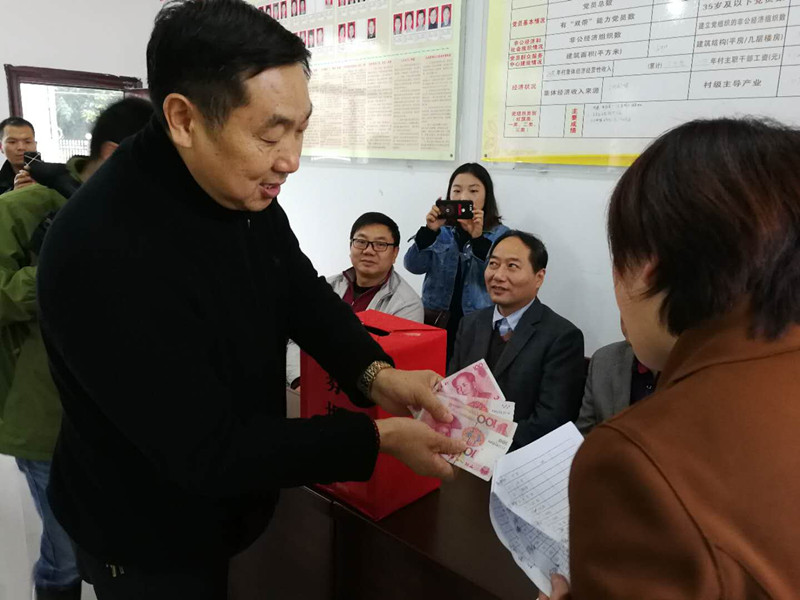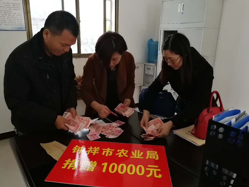 在龚集村党员群众服务中心,市农业局班子成员和全体帮扶干部自发踊跃捐款,随后将捐得的费用购买肥料发放到贫困户手中。